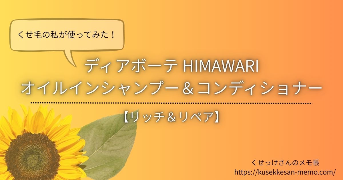 今回は「広がりを抑えてしっとりまとまる」というところが気になり、「ディアボーテ HIMAWARI リッチ&リペア」シャンプー&コンディショナーのサンプル(サシェ)を試してみたので紹介しました。
